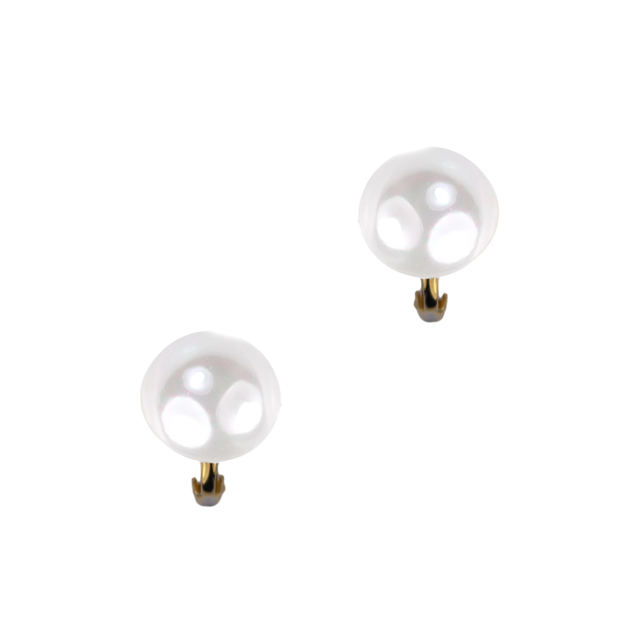 The Primrose clip earrings feature 20mm or 14mm imitation pearls, set in gold plated base metal.