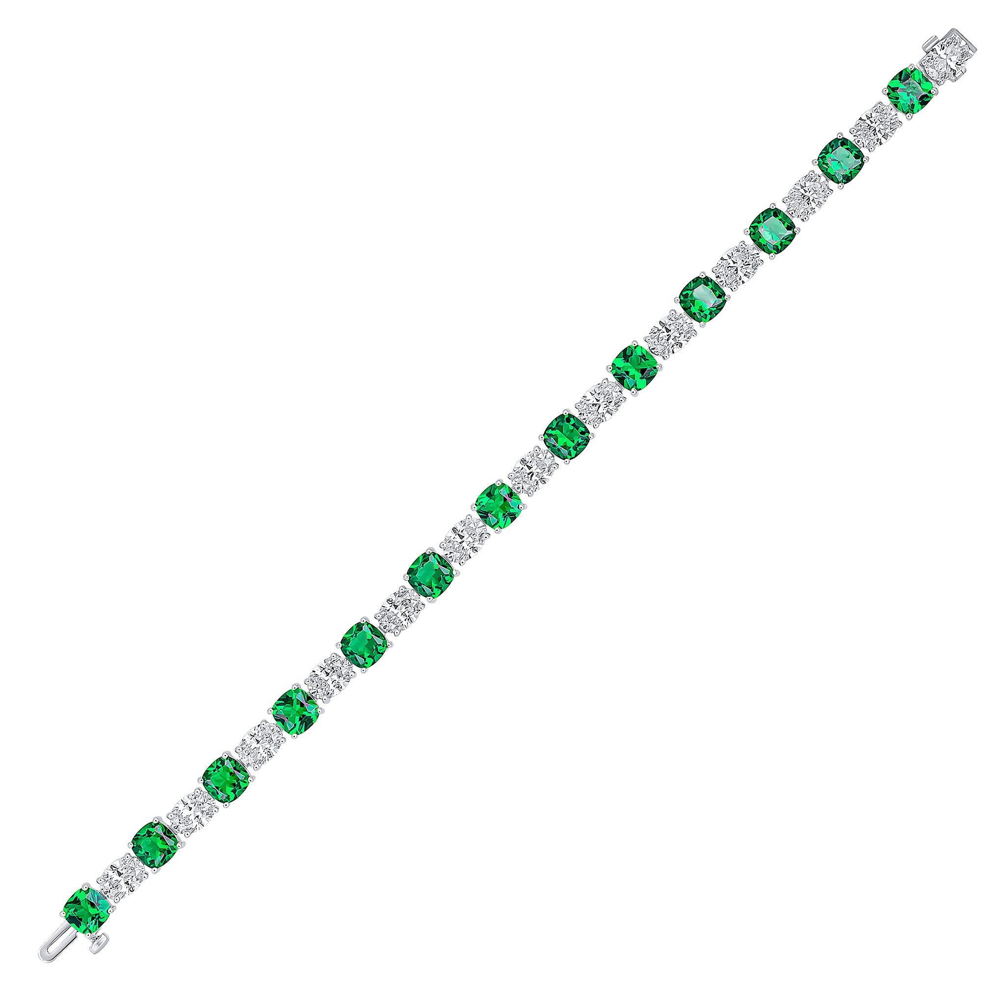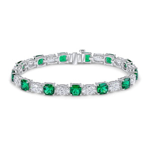 the Annie bracelet features alternating emerald 6x6mm cushion-cut cubic zirconia stones and white 7x5mm oval stones, set in rhodium plated sterling silver. This bracelet has a hidden safety clasp which clicks into place underneath the clasp.