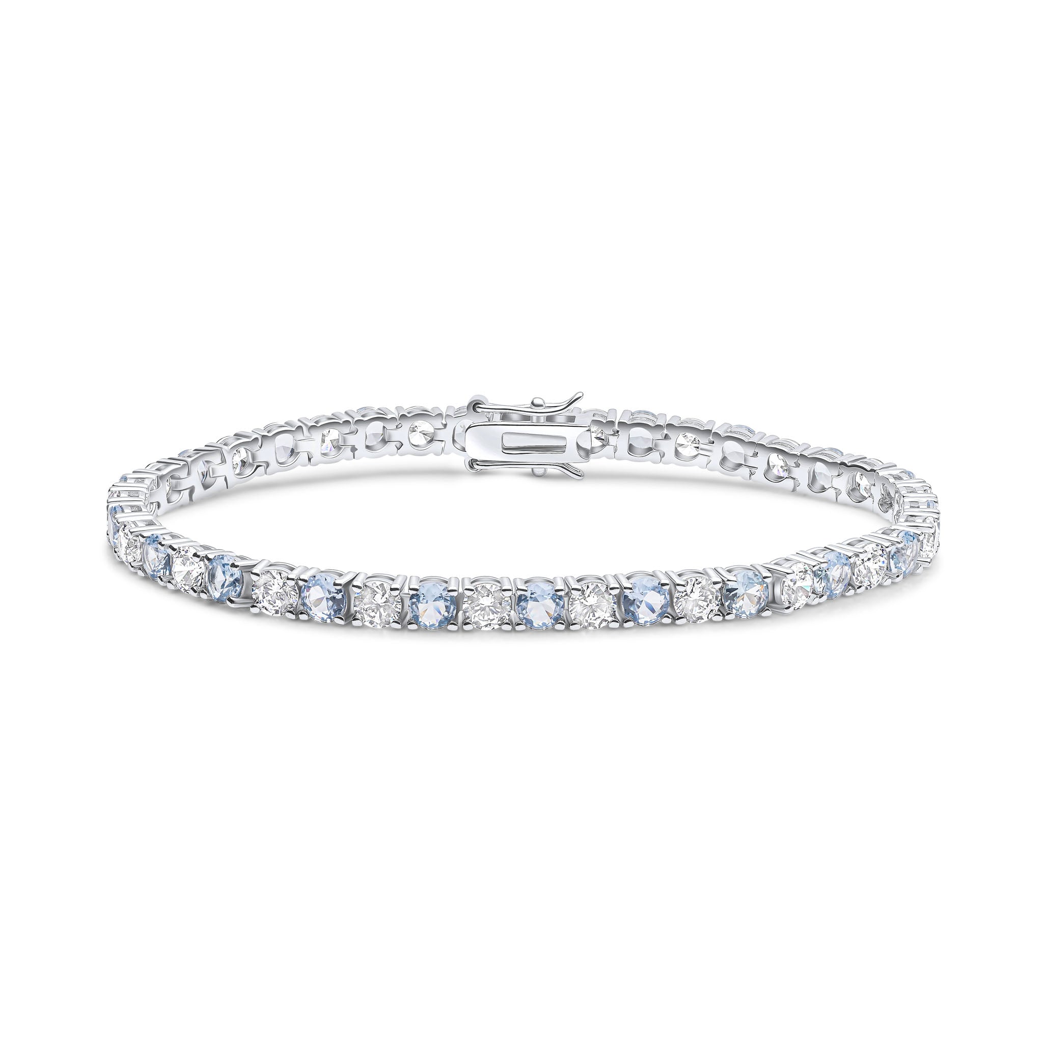 The Cressida tennis bracelet features alternating 4mm (0.25ct) aqua and white cubic zirconia stones set in rhodium-plated sterling silver. This bracelet has a double figure-8 safety clasp.