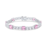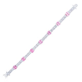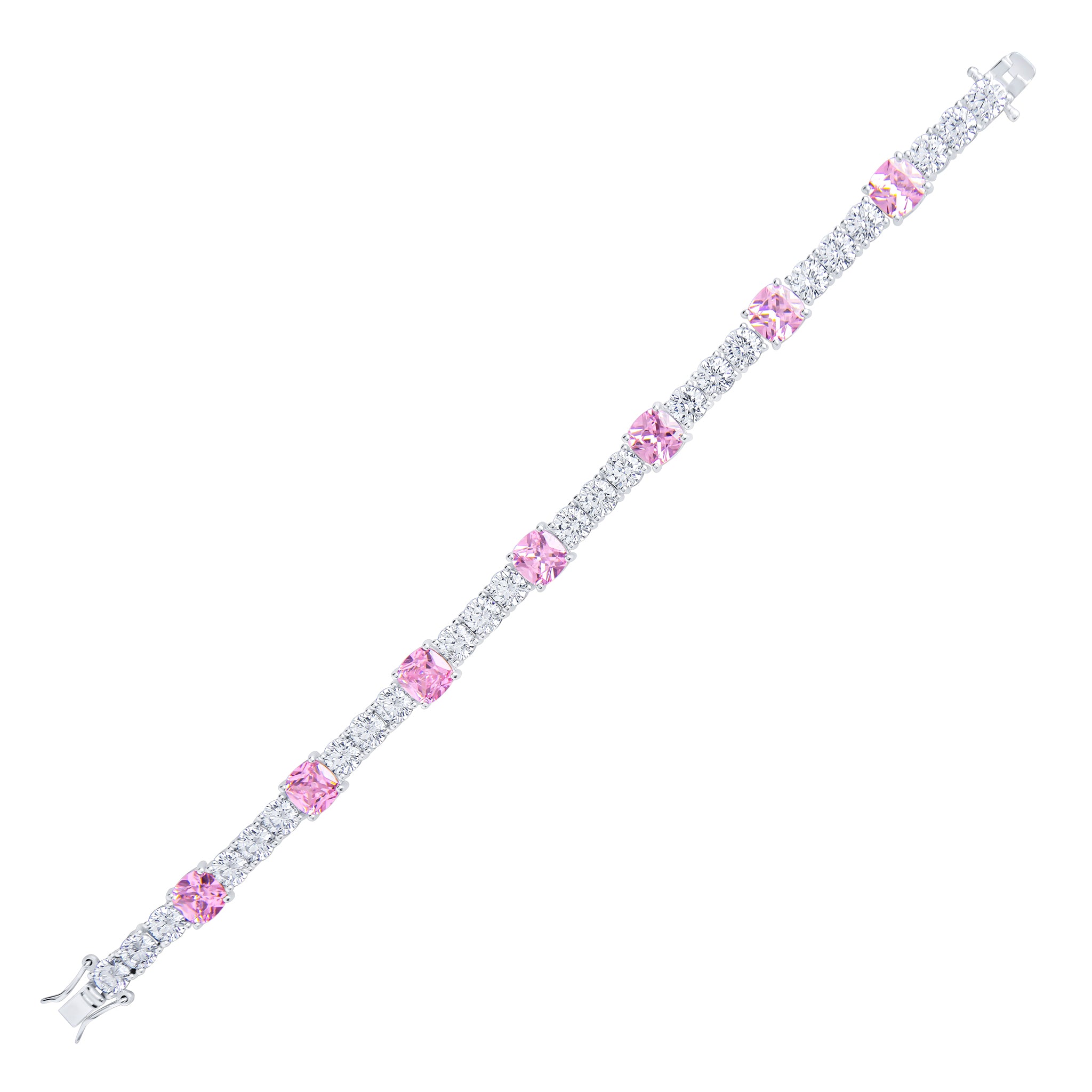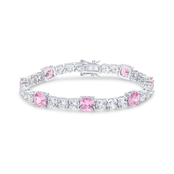 The Ruthie bracelet features 5mm round white cubic zirconia stones and 7x7mm pink stones. This bracelet is set on rhodium-plated sterling silver with a double safety catch and measures approximately 7" in length.