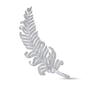 The Deco Feather brooch features all-white round pavé and channel-set square cubic zirconia stones in a beautiful feather design. This brooch is set in rhodium-plated sterling silver and has a standard brooch pin fastening at the back.