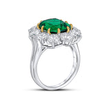 The Maha ring features a 12x10mm emerald radiant-cut cubic zirconia centre with gold-plated claws surrounded by white round stones set on rhodium-plated sterling silver. This ring has a polished band.