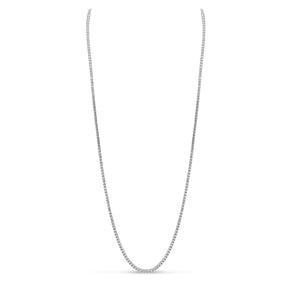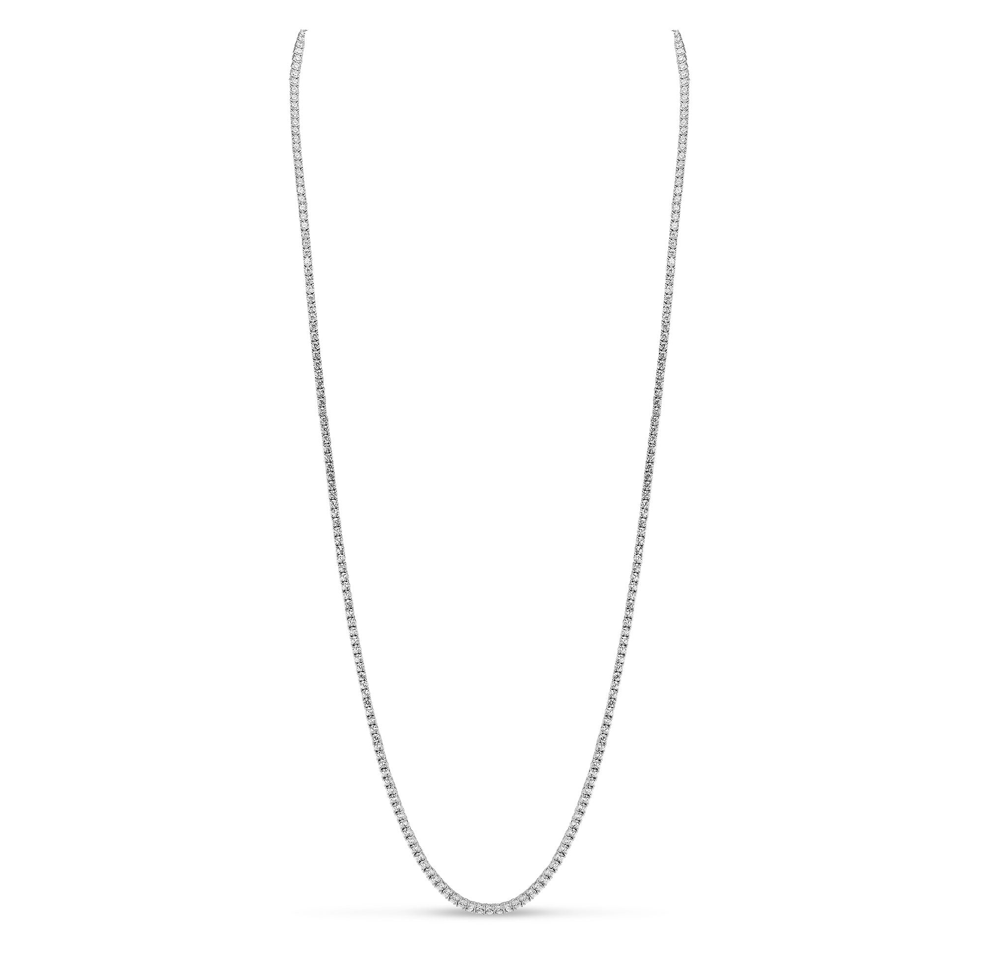 The Vicky long tennis necklace features 34" of all-white 3mm round cubic zirconia stones, set in rhodium-plated base metal.