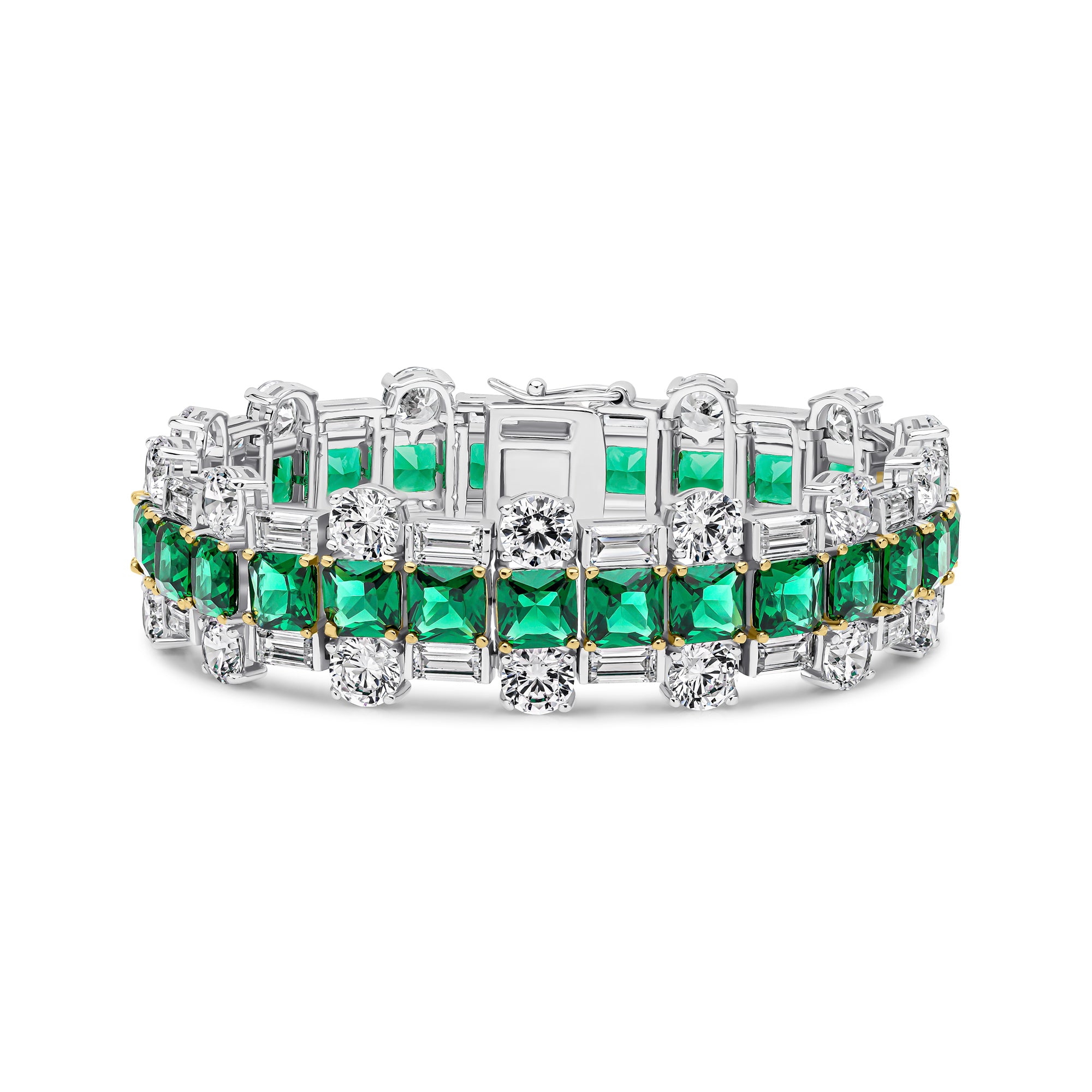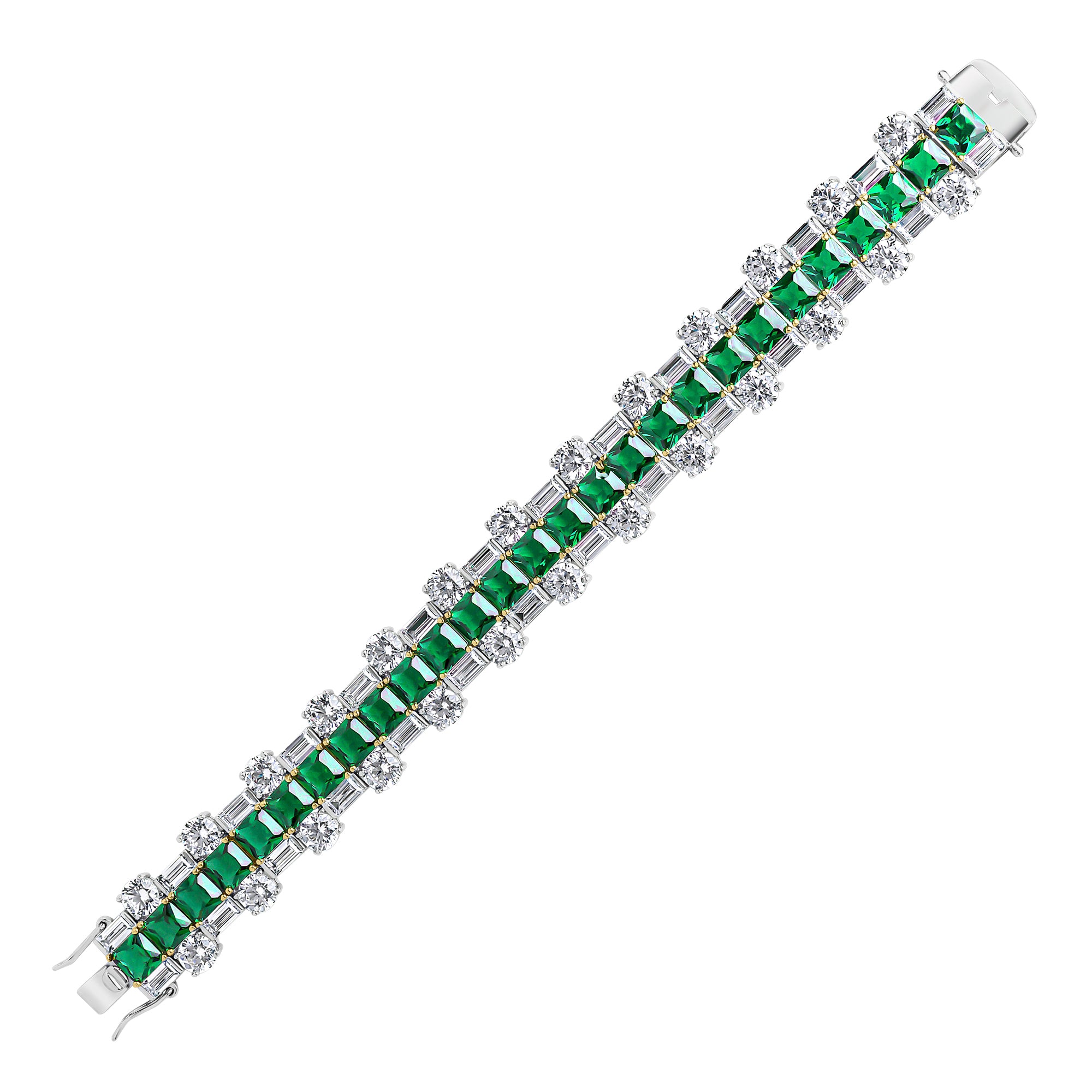 The Nicole bracelet features an Art-Deco design of 6x6mm emerald princess cut, 5mm white round and 6x3mm white baguette cubic zirconia stones. This bracelet is set in two-tone gold and rhodium plated sterling silver with a double safety clasp. It measures 6.75" in length and is approximately 17mm wide.