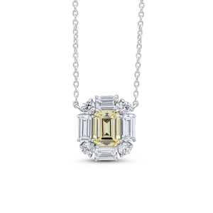 The Gillian pendant features an 8x6mm pale canary yellow emerald-cut cubic zirconia centre with a white baguette and round surround. This pendant is set in rhodium-plated sterling silver with a 16.5"+ 1" extension chain included.