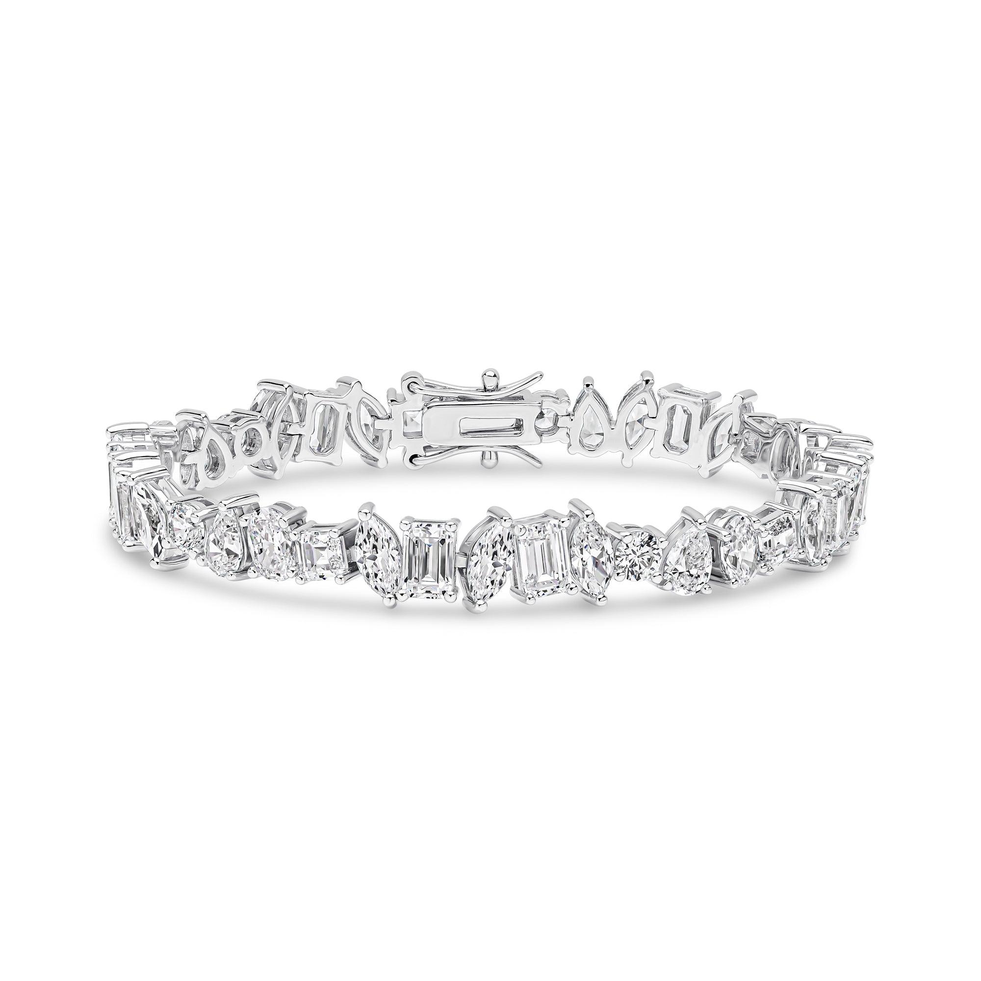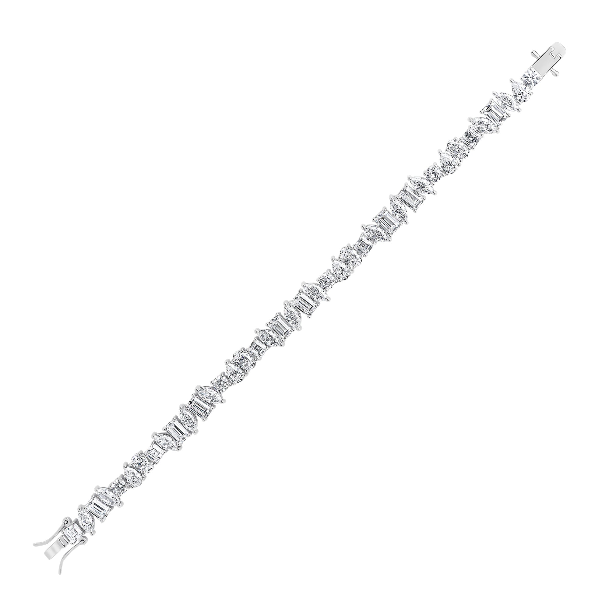 The Delta bracelet features all-white multi-cut (asscher, marquise, round, pear, oval and emerald-cut) cubic zirconia stones. This bracelet is set on rhodium-plated sterling silver and measures approximately 7" with a double safety-catch.