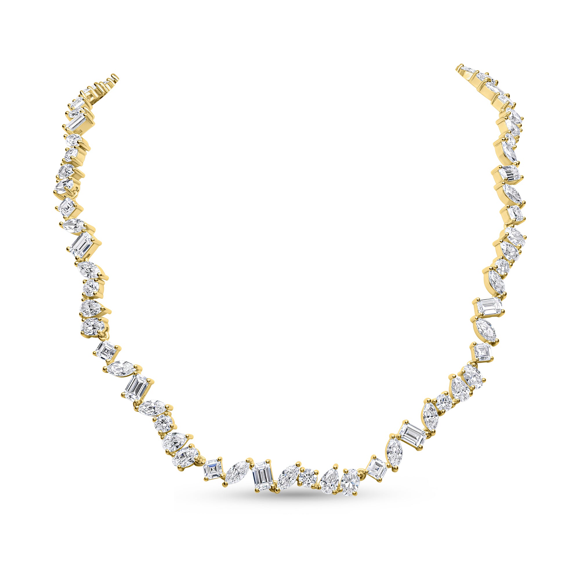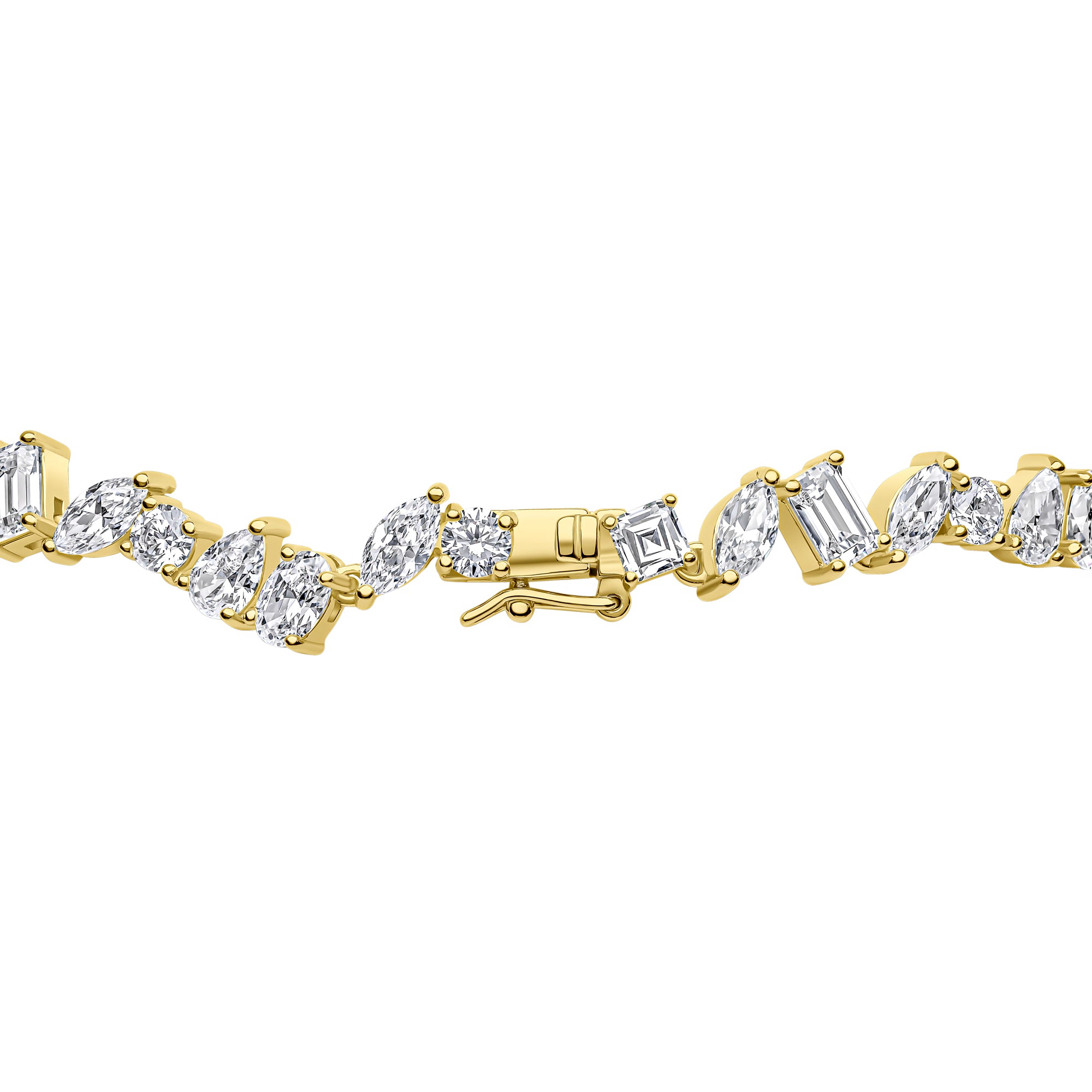 The Delta necklace features all-white multi-cut (asscher, marquise, round, pear, oval and emerald-cut) cubic zirconia stones, set on gold-plated sterling silver and measures approximately 16".
