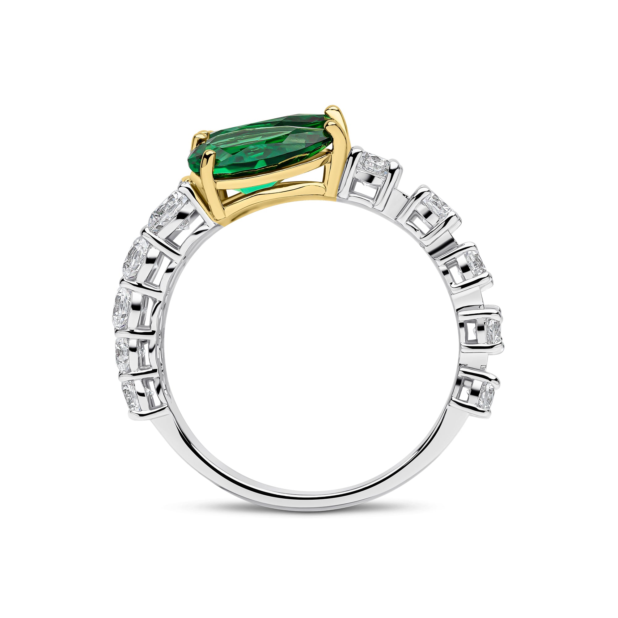 The Maddy ring features graduating white round cubic zirconia stones with three central emerald cubic zirconia pear-shape stone. This ring is set in two-tone gold and rhodium plated sterling silver.