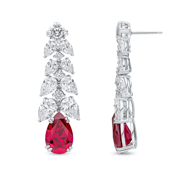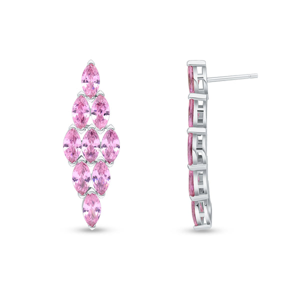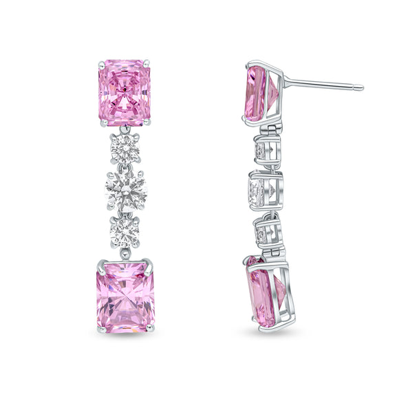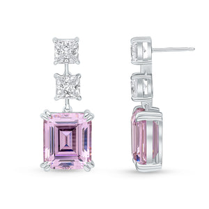 The Maura earrings feature white 6x6mm princess-cut cubic zirconia stones and a 14x12mm pink emerald-cut stone drop. These earrings are set on rhodium-plated sterling silver with a post and butterfly fitting.