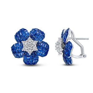 The Rhoda earrings feature invisibly-set square sapphire cubic zirconia stones with a round white cluster stone centre. These earrings are set in rhodium-plated sterling silver with a post and omega fitting.
