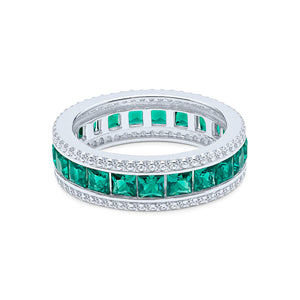 The Anna-lisa full-eternity ring features a centre row of emerald princess-cut cubic zirconia stones with two pavé white stone outer rows. This ring is set in rhodium plated sterling silver with a channel-set edge.