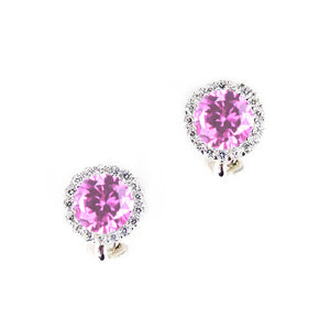 The Margot clip-on earrings feature a pink round cubic zirconia centre stone surrounded by smaller white stones, set in rhodium-plated sterling silver.