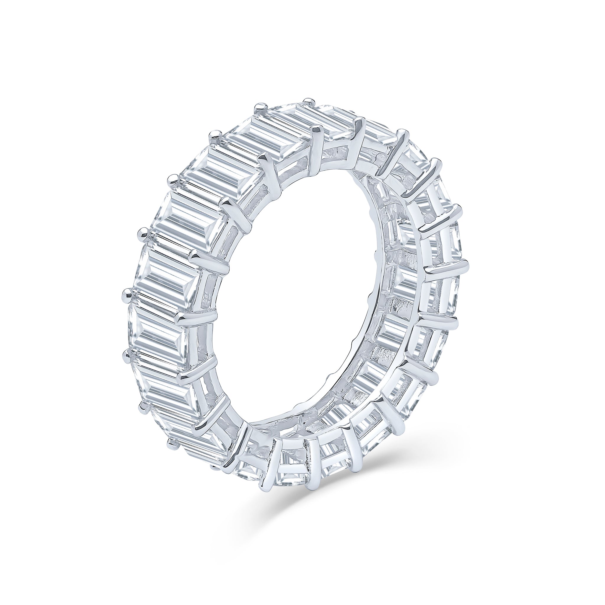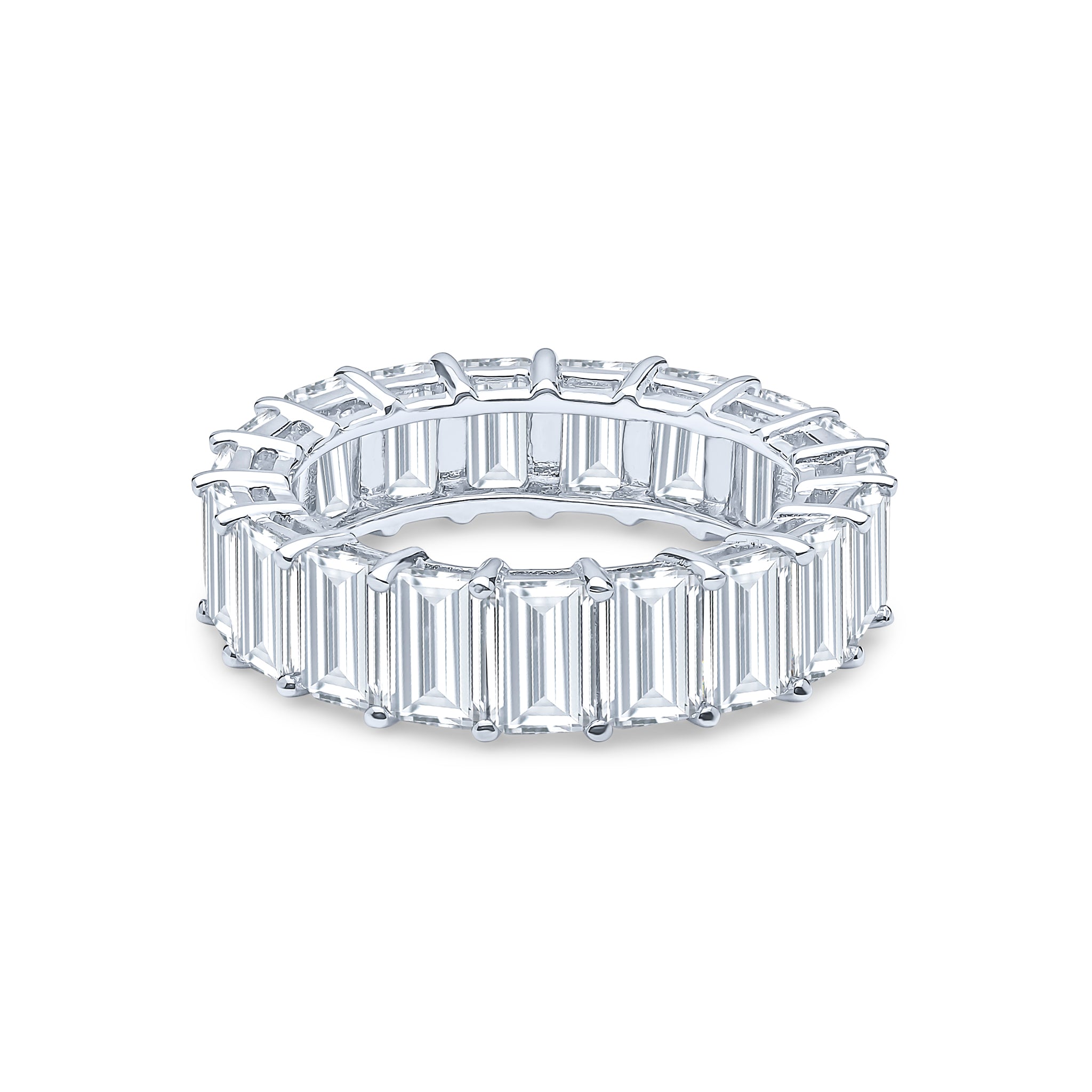 The Adara full-eternity ring features all-white 6x4mm baguette cubic zirconia stones set in rhodium-plated sterling silver.