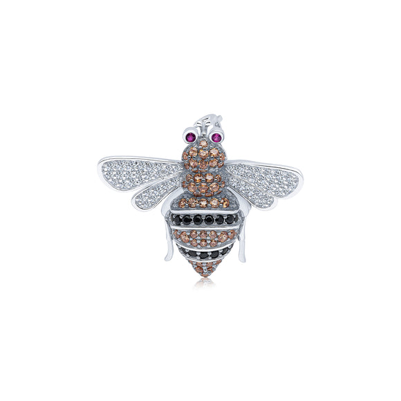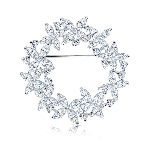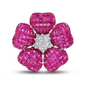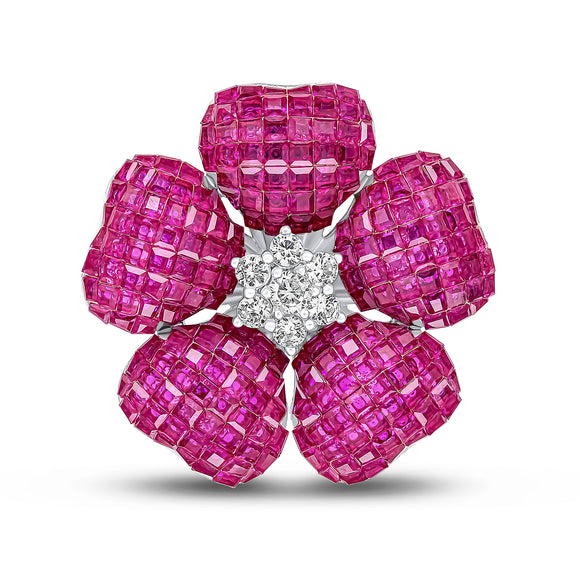 The Rhoda brooch features invisibly-set square pinkish-ruby cubic zirconia stones with a round white cluster stone centre. This brooch is set in rhodium-plated sterling silver with a classic pin back but can also be worn as a pendant due to the loop at the back.