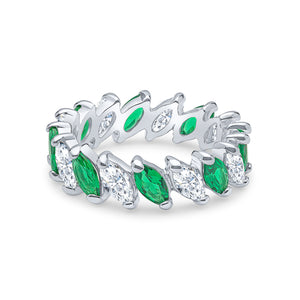 The Demeter full-eternity ring features alternating white and emerald marquise cubic zirconia stones set in rhodium-plated sterling silver.