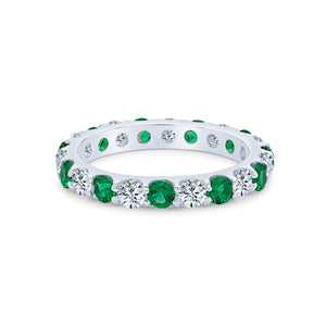The Harmonia full-eternity ring features alternating 3mm round emerald and white cubic zirconia stones, set in rhodium-plated sterling silver.