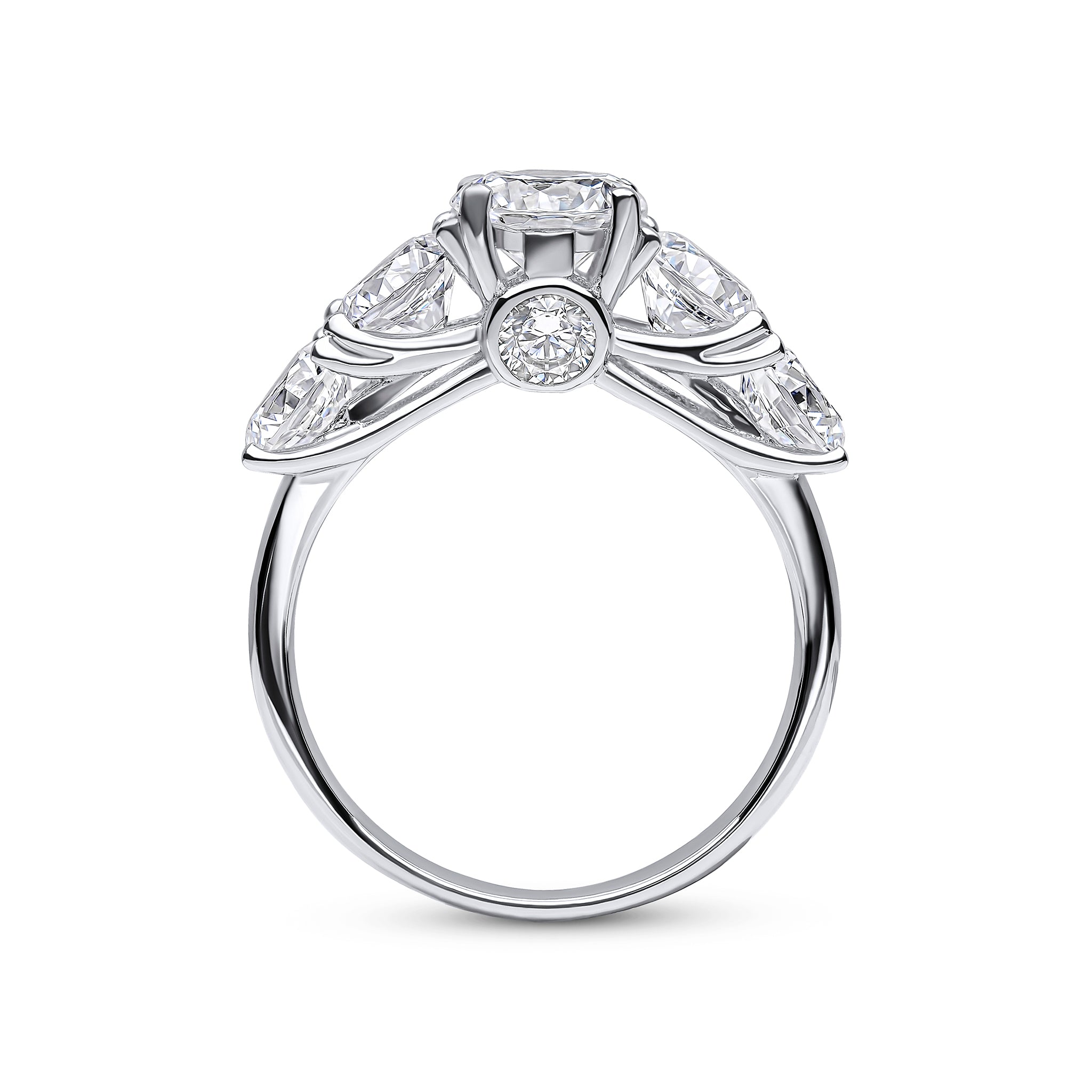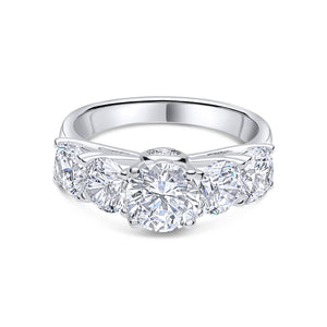 The Garland ring features five graduated white round cubic zirconia stones with white bezel stones in the setting. This ring is set in rhodium-plated sterling silver with a polished band.