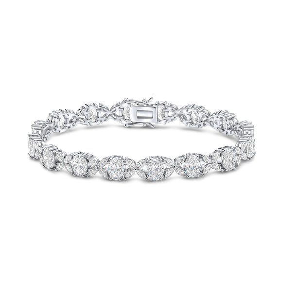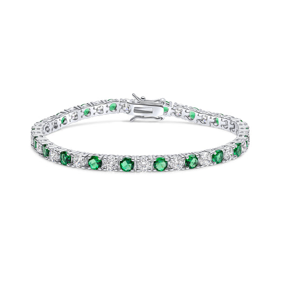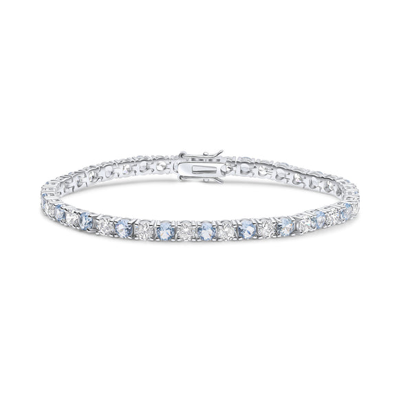The Nicole bracelet features an Art-Deco design of 6x6mm canary princess cut, 5mm white round and 6x3mm white baguette cubic zirconia stones. This bracelet is set in two-tone gold and rhodium plated sterling silver with a double safety clasp. It measures 7" in length and is approximately 17mm wide.