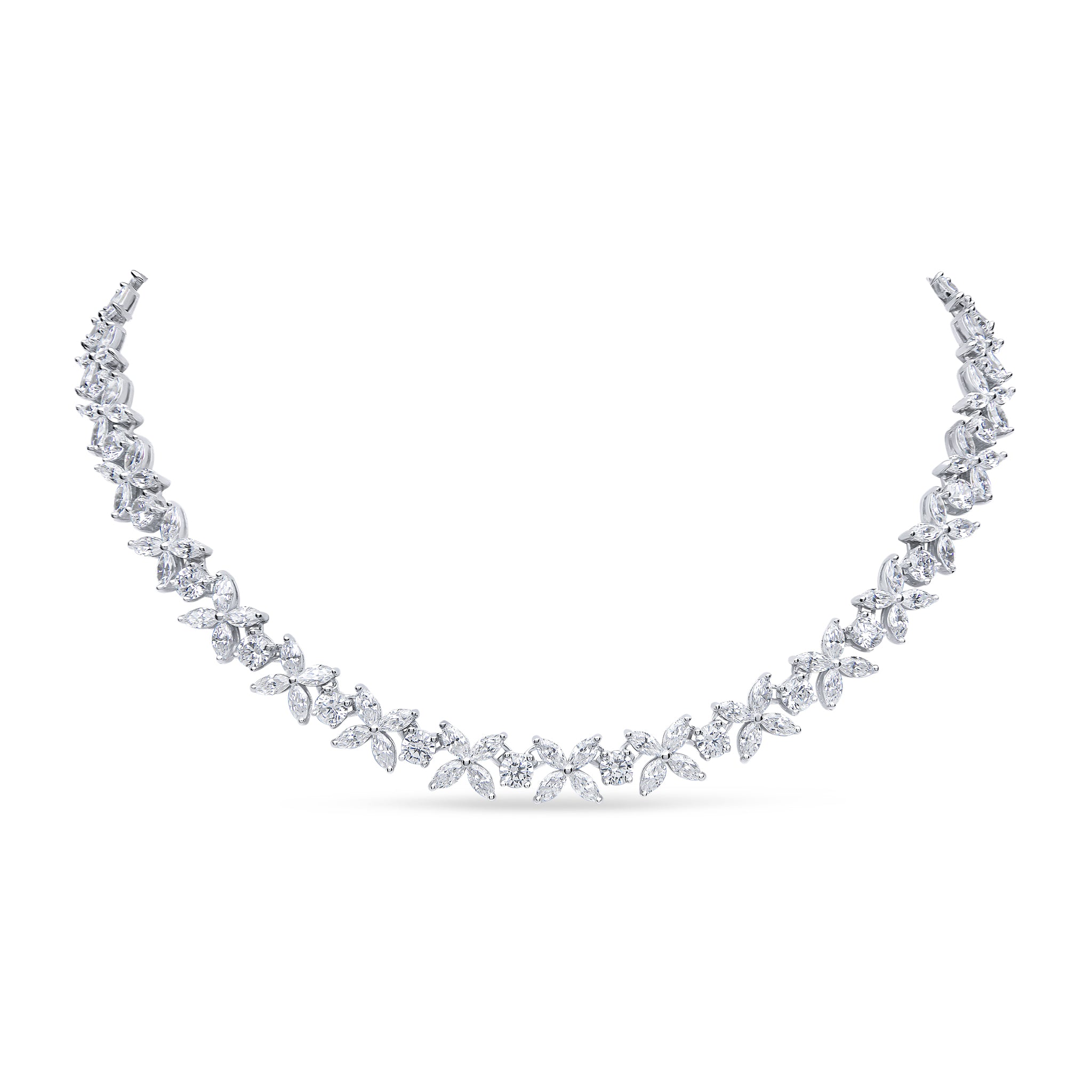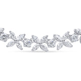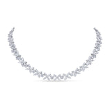 The Kitty choker features alternating 2.5mm round cubic zirconia stones with marquise stone flowers. This necklace is set on rhodium-plated sterling silver and measures 14". It measures approximately 8.5mm in width.