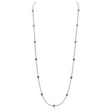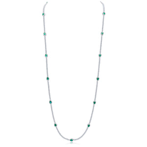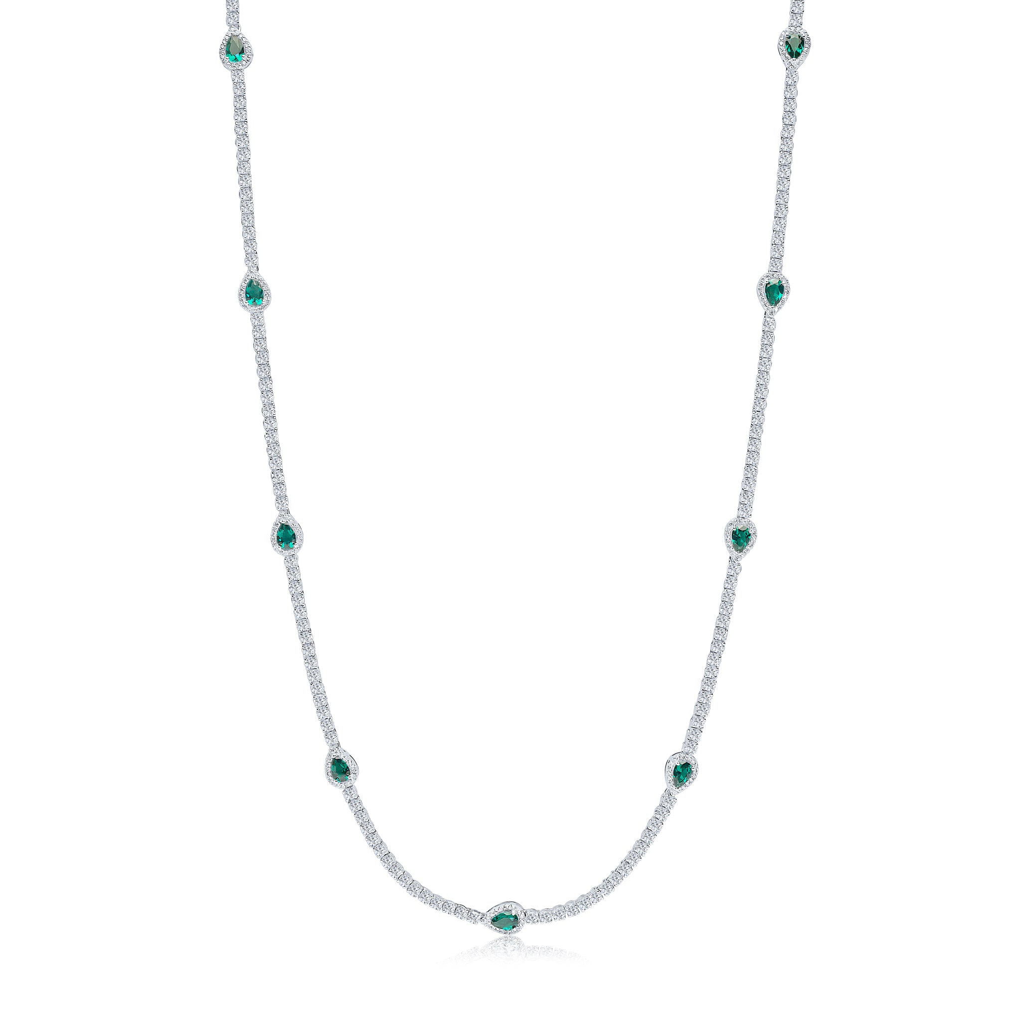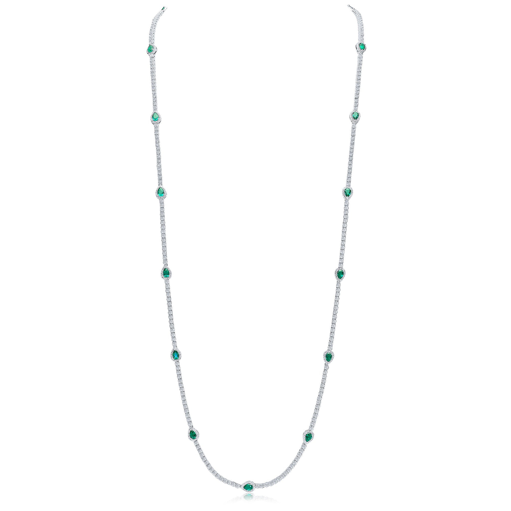 The Francine long necklace features 34" of all-white round 3mm cubic zirconia stones with scattered emerald-coloured pear stations with pavé surround. This necklace is set on base metal with a rhodium plating.