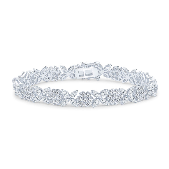 The Petal bracelet features 7" of all-white flower clusters of marquise and round brilliant cubic zirconia stones. This bracelet is set in rhodium-plated sterling silver with a double safety clasp.