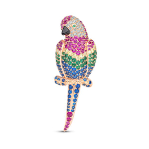 The Parrot brooch features multi-colour pavé cubic zirconia stones and black enamel detail. This brooch is set on rose gold plated sterling silver with a standard brooch pin fastening at the back.
