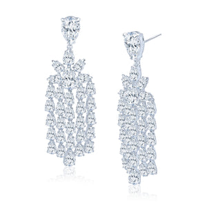 The Artemis chandelier earrings feature all white pear-shaped cubic zirconia stones with a large pear stone top and 5-strand drop. These earrings are set in rhodium plated sterling silver with a post and butterfly fitting.