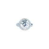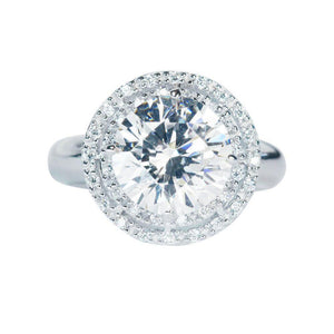 The Cara ring features a 10mm round white cubic zirconia centre surrounded by two rows of white pavé stones, set in rhodium-plated sterling silver.