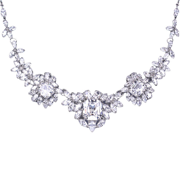 The Contessa necklace features all-white asscher-cut cubic zirconia stones with marquise stones, all set in rhodium-plated sterling silver.