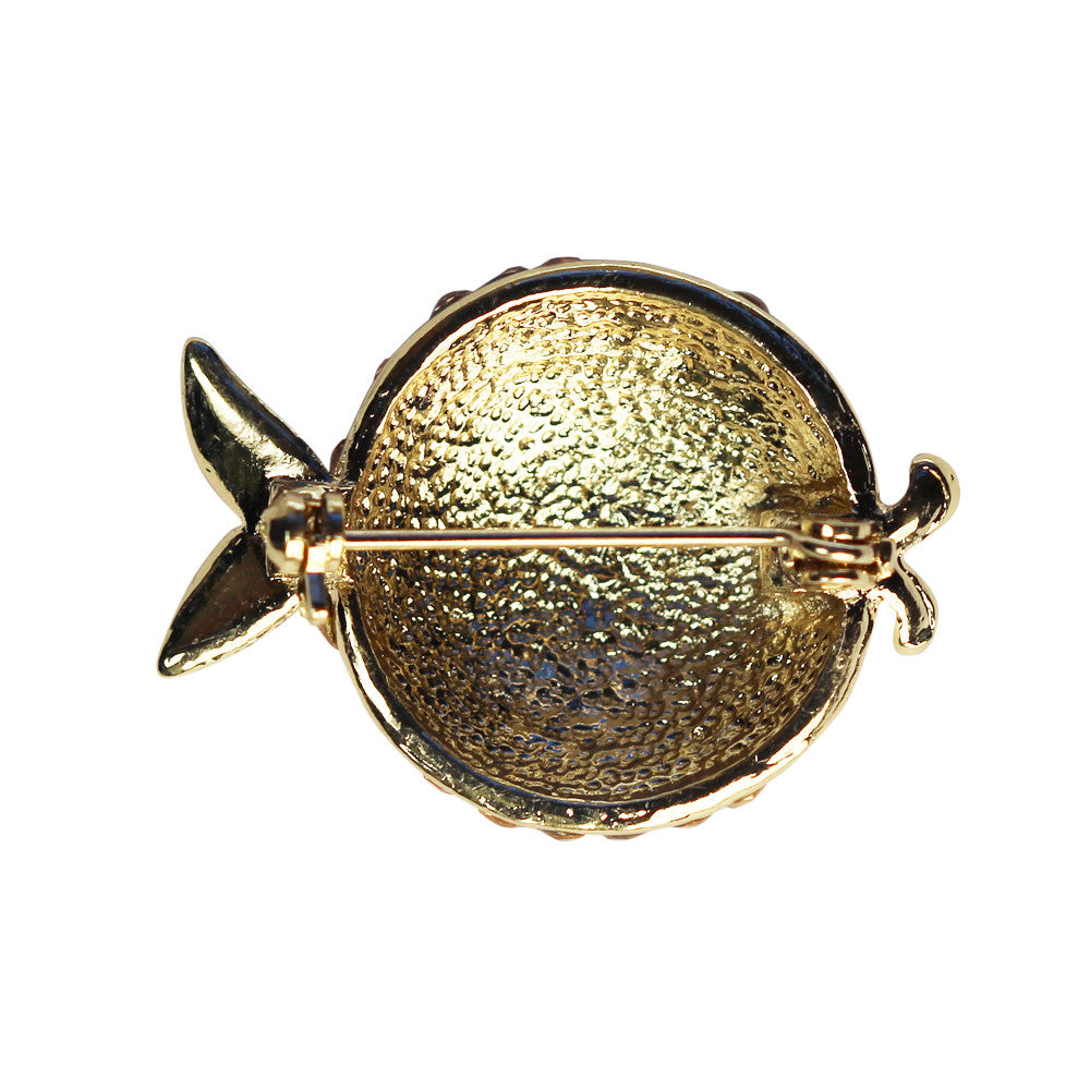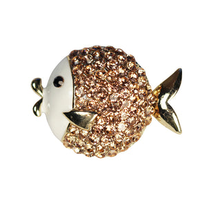 The Pufferfish brooch combines white enamel with champagne crystals set in gold-plated metal base. Measures approximately 24x32mm.