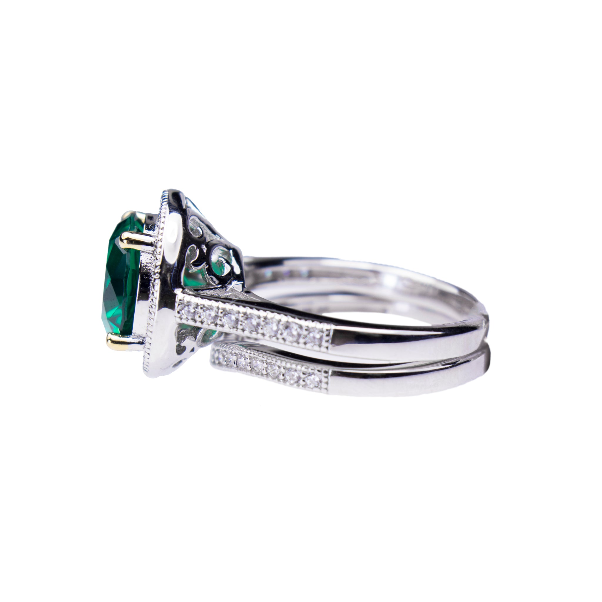 The Kathy ring set features a 10mm round emerald cubic zirconia centre stone with gold-plated claws, surrounded by white micro pavé stones partnered with a half eternity all white micro-pavé ring. This ring duo is set in rhodium-plated sterling silver.