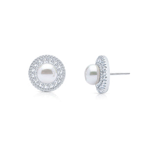 The Montana earrings feature a button imitation pearl centre with two rows of pavé and round white cubic zirconia stones. These earrings are set in rhodium plated sterling silver with a centre post and butterfly fitting.