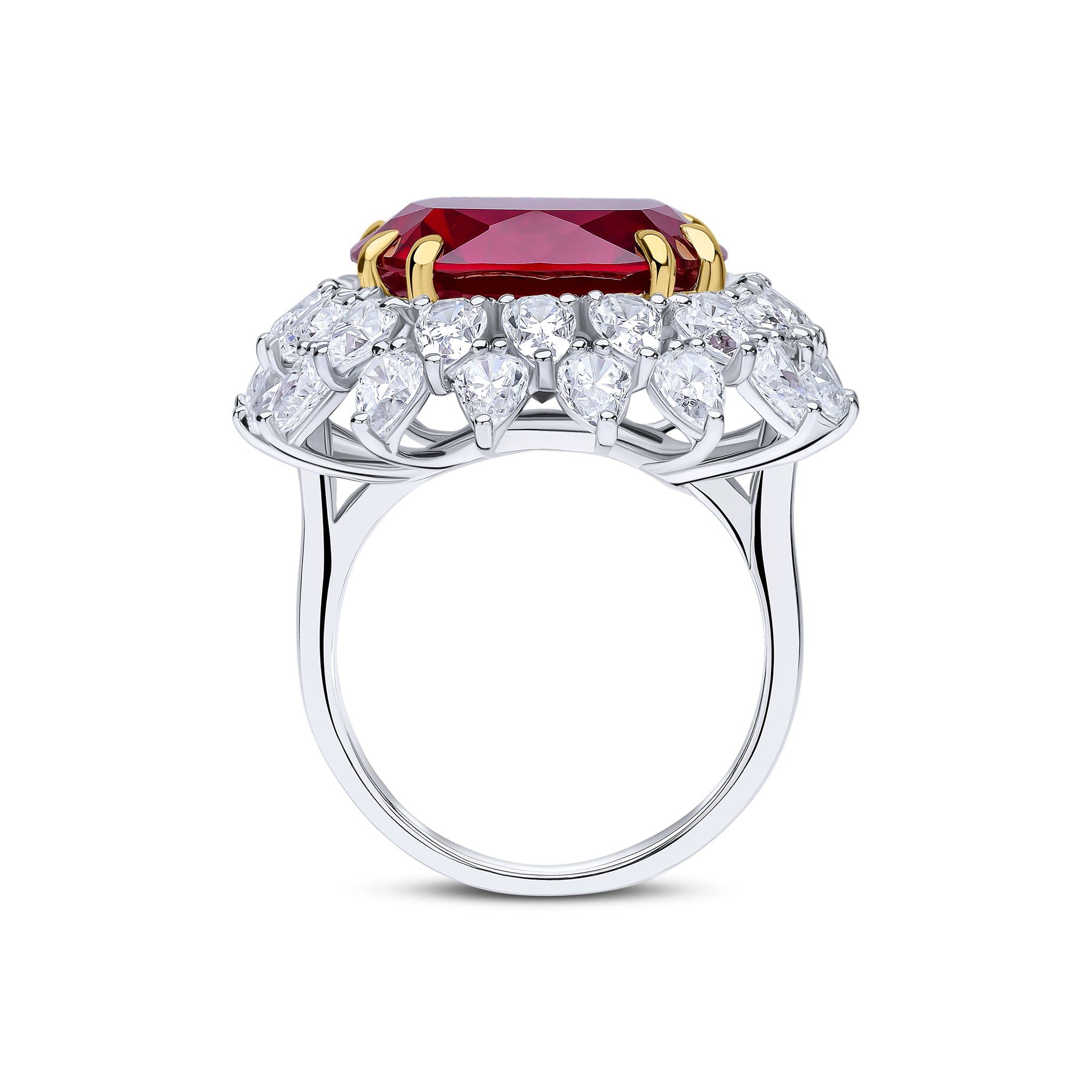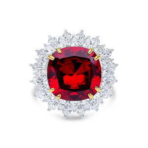 The Amira ring features a 16x16mm ruby cushion-cut cubic zirconia centre stone and two rows of white surrounding round stones. This ring is set on two-tone plated sterling silver.