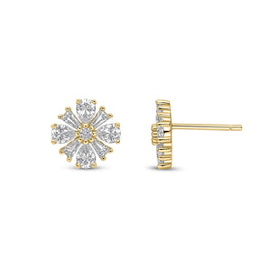 The Emmy earrings feature a cluster of all-white pear, tapered baguette and round cubic zirconia stones. These earrings are set on gold-plated sterling silver with a post and butterfly fitting.