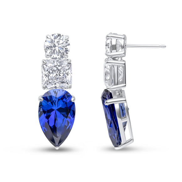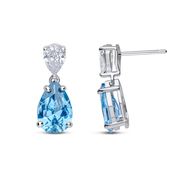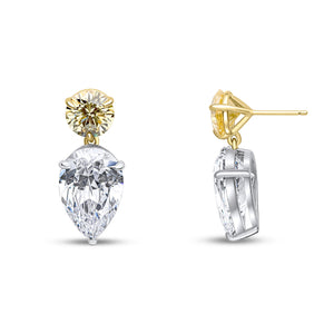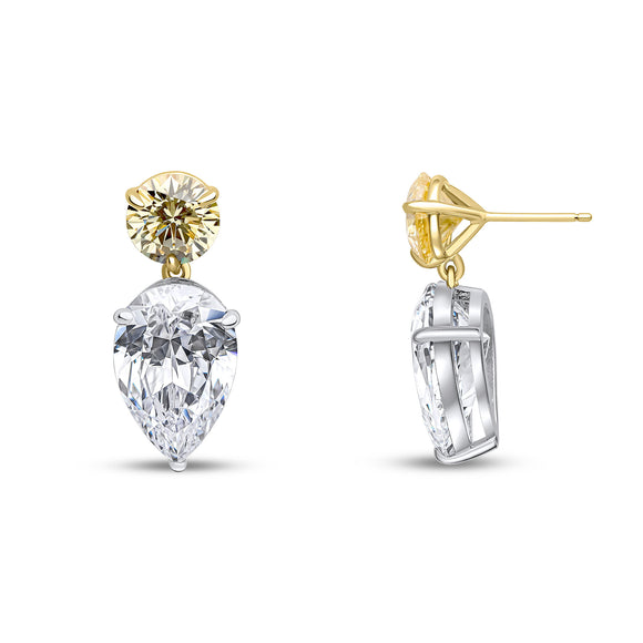The Tayla earrings feature a 9mm round pale canary cubic zirconia top with a white 19x12mm upside-down pear-shaped drop. These earrings are set on two-tone plated sterling silver with a post and butterfly fitting.
