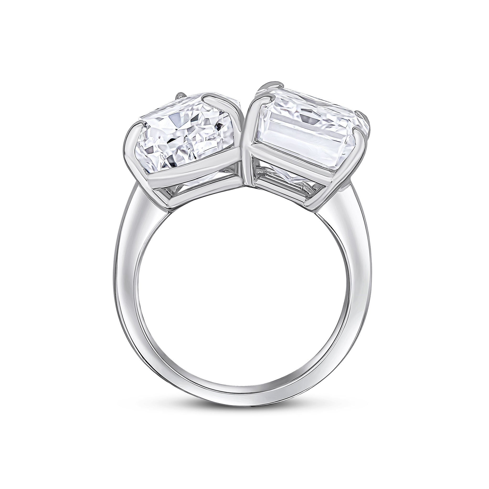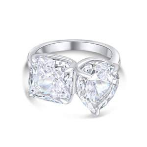 The Cindy moi et toi ring features all-white 13x10mm pear-shaped and 10x10mm cushion-cut cubic zirconia stones, set on rhodium-plated sterling silver.