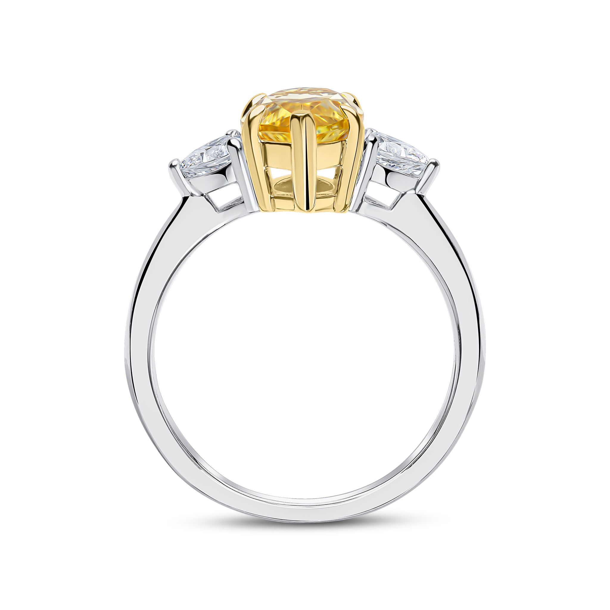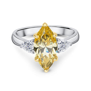 The Liberty ring features a 14x7mm canary marquise cubic zirconia centre stone with 4x4mm white heart-shaped side stones. This ring is set on two-tone rhodium and gold-plated sterling silver with a polished band.