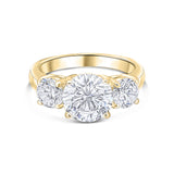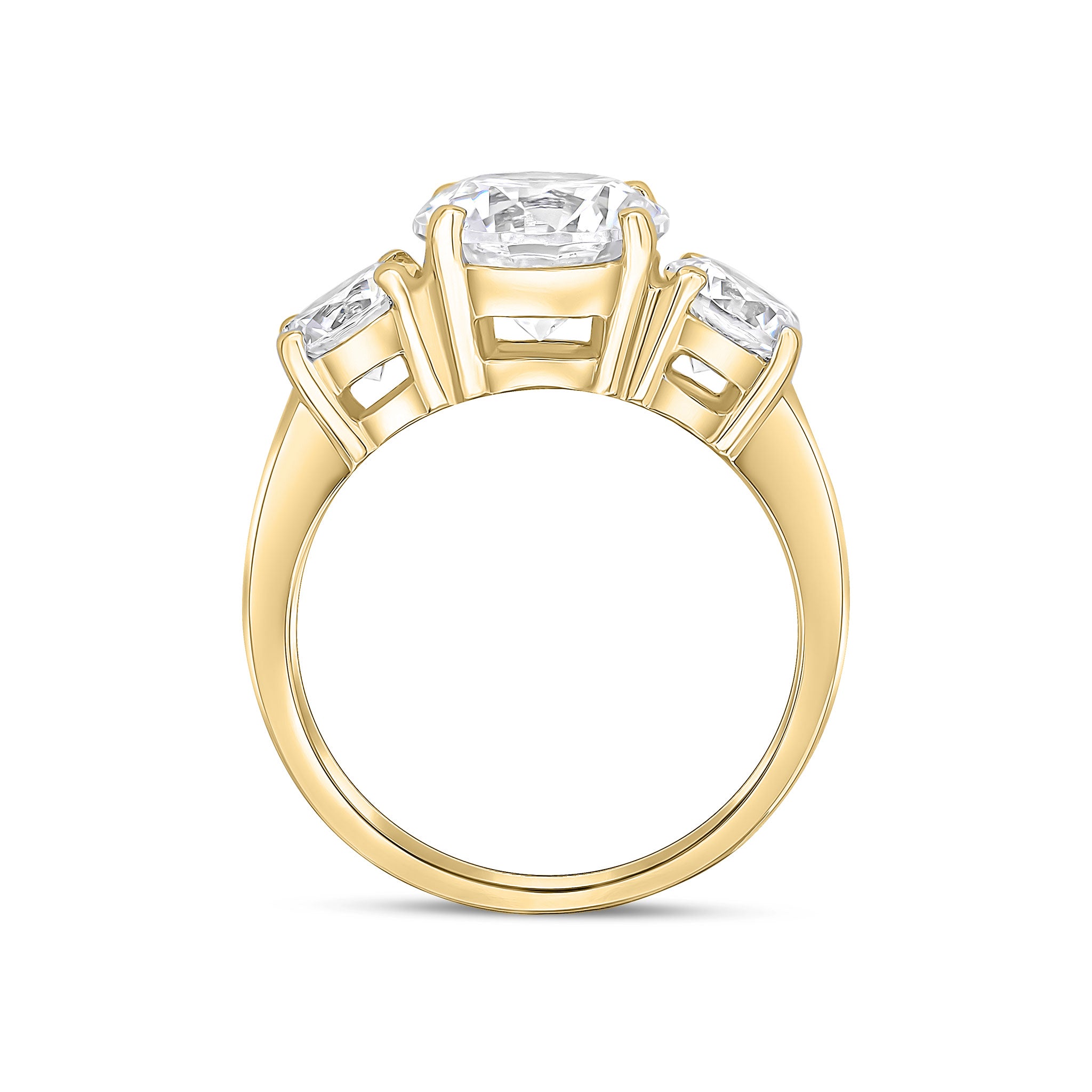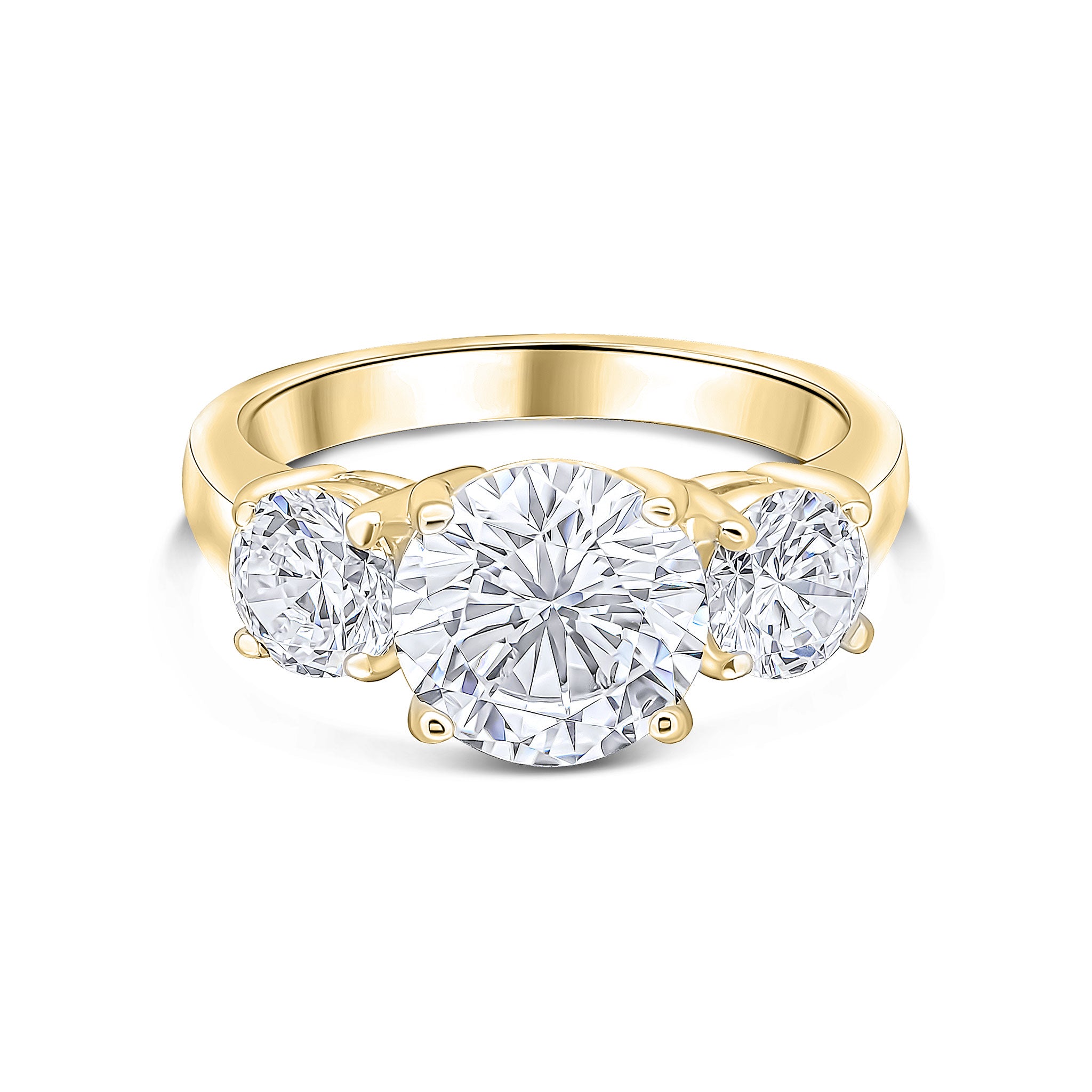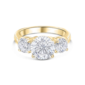 The classic Trilogy ring features three all-white round brilliant cubic zirconia stones measuring 8mm (centre) and 5mm (sides). This ring is set in gold-plated sterling silver with a polished band.