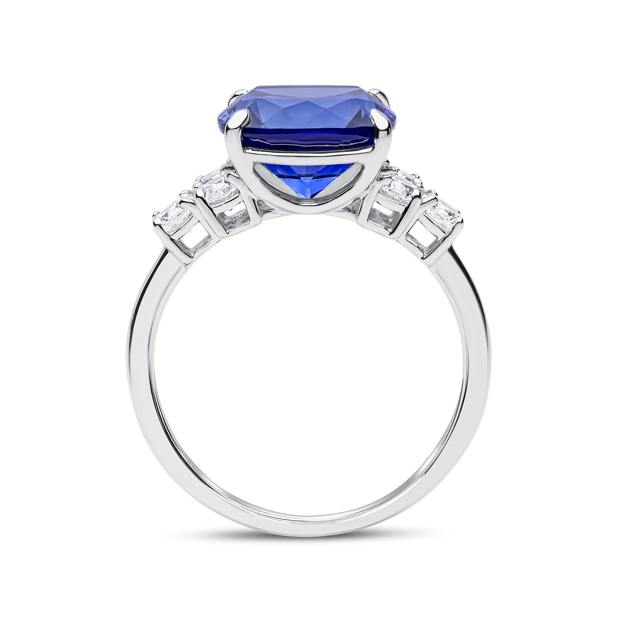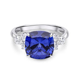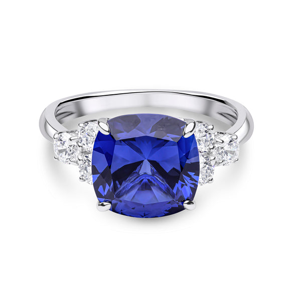The Alexa ring features a 10x10mm sapphire cushion cubic zirconia centre stone with white stone cluster side stones. This ring is set in rhodium-plated sterling silver.