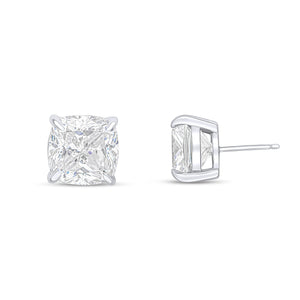 The Bella earrings feature 8x8mm white cushion-cut cubic zirconia stones, set on rhodium-plated sterling silver with a post and butterfly fitting.