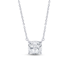 The Bella pendant features a floating 9x9mm white cushion-cut cubic zirconia stone and is set in rhodium plated sterling silver with a chain included.