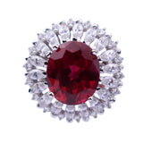 The Belle ring features a 12x10mm ruby oval cubic zirconia centre stone surrounded by white round and marquise stones. This ring is set in rhodium-plated sterling silver.