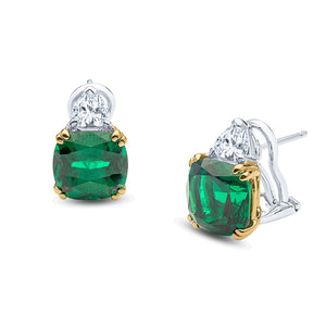 The Brooke earrings feature a 10x10mm emerald cushion-haped cubic zirconia stone with a white heart stone top. This earring is two-tone gold and rhodium plated sterling silver with a post and omega fitting.