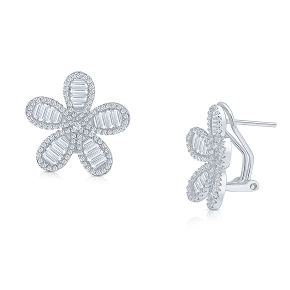 The Constance earrings feature a daisy design of all-white baguette and round cubic zirconia stones, set in rhodium plated sterling silver. These earrings have a post and omega fitting.