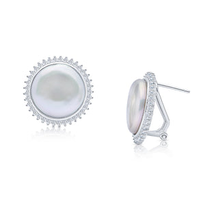 The Emma earrings feature a 16mm coin-shaped white freshwater pearl surrounded by small round white cubic zirconia stones. These earrings are set in rhodium plated sterling silver and have a post and omega fitting.