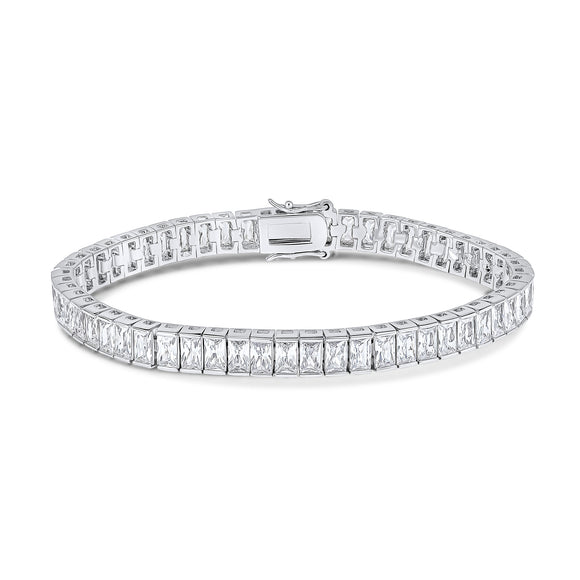 The Erin bracelet features all white channel-set radiant-cut cubic zirconia stones set in rhodium-plated sterling silver. This bracelet measures approximately 7".