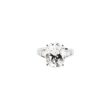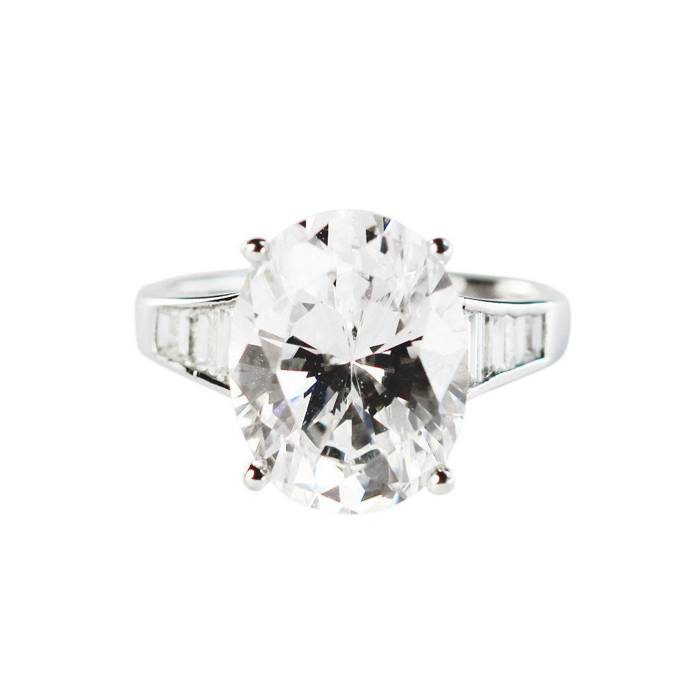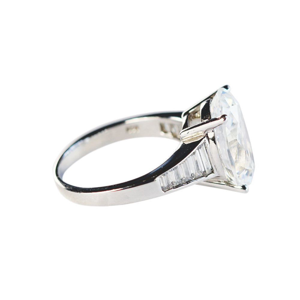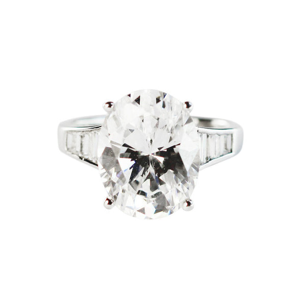 The Francesca ring features a 14x11mm white oval cubic zirconia centre centre stone with channel-set graduated white baguette stone shoulders. This ring is set in rhodium-plated sterling silver.