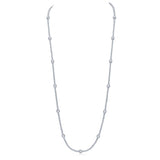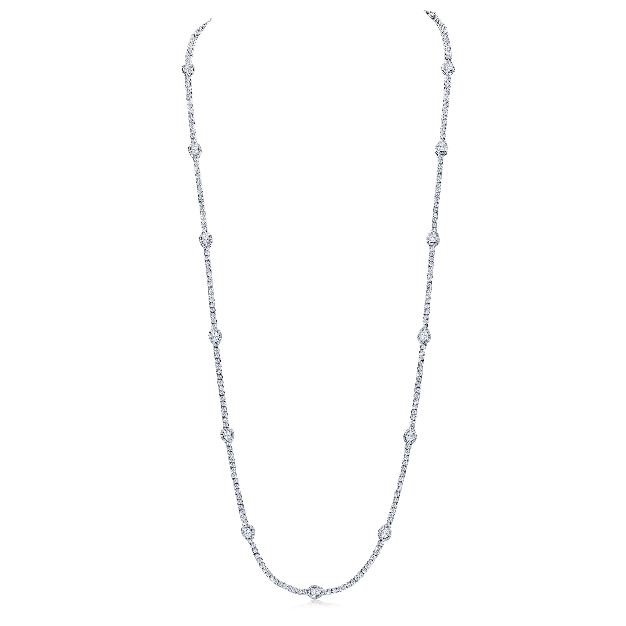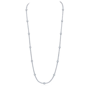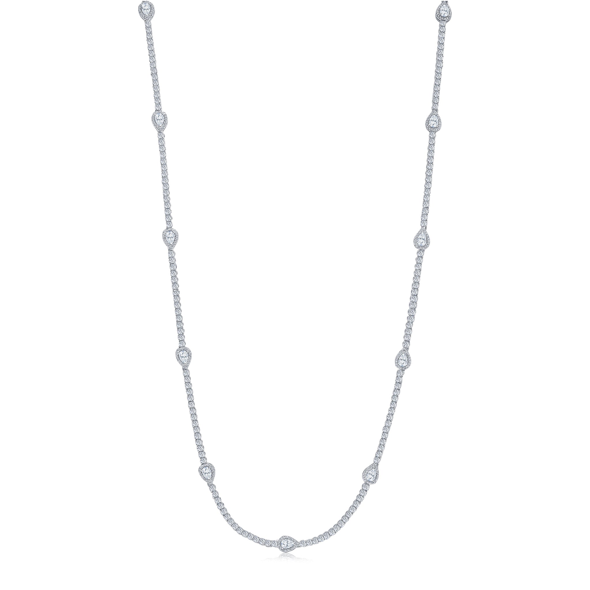 The Francine long necklace features 32" of all-white round 3mm cubic zirconia stones with scattered pear stations with pavé surround. This necklace is set on base metal with a rhodium plating.