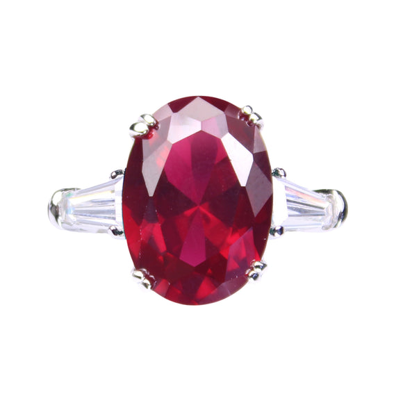 The Frankie ring features a ruby 14x10mm oval cubic zirconia centre with white baguette shoulders, all set in rhodium-plated sterling silver.