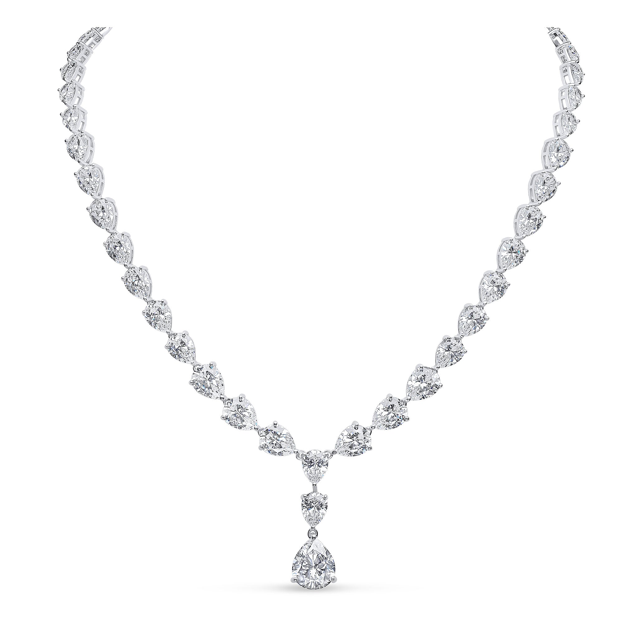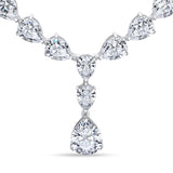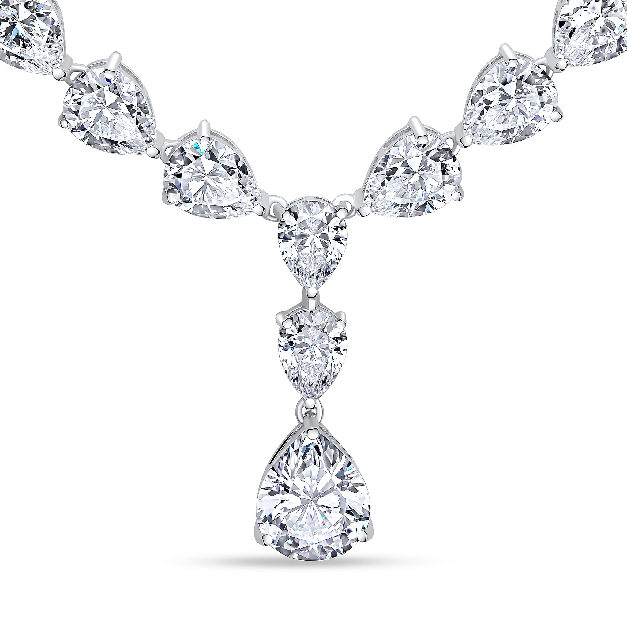 The Geneva necklace features all-white pear cubic zirconia stones with a 12x10mm drop front. This necklace is set in rhodium-plated sterling silver. The necklace measures approximately 16.25" + a 5cm drop.